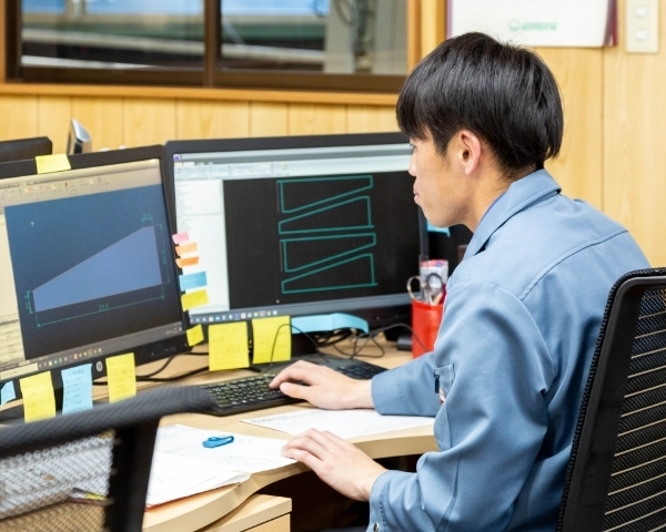 総務部のバトンは設計部へと渡ります。切断図を描き、切断経路図面を組み上げるという基本的な役割はもちろん、これからは、1枚の組立図から部品にばらす、3Dデータを読み取るなど、これまでのCAD業務を超えた、新しい仕事もお受けいたします。